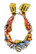 The beaded bandana necklace is designed using ultra soft blocked printed bandanas. Carefully cut down and hand tied to create a comfortable style with a bold look. Each piece is interwoven with staple beads and tied onto a brass snap closure.