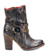 - Heeled ankle bootie with an “O” ring harness, and decorative “x” strap inlays