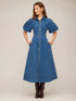 This midi dress is crafted from stretch denim for added comfort and ease. It features puff sleeves with lined interiors for added shape and comfort, a pointed collar, and a full snap-button front closure. Subtle princess seams define the waist, while the wide hem and two side pockets add thoughtful structure and function to the flattering midi silhouette