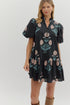 Floral short bubble sleeve ruffle hem mini dress featuring ruffle neck band collar gold accent button closure. Side pockets. Lined. Woven. Non-sheer. Lightweight.