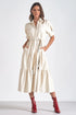 Elevate your holiday style with the Maisie Midi Dress. This faux leather, tiered design offers a chic silhouette, making it the perfect statement piece for the holidays.