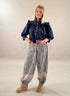 Looking for a piece that feels both powerful and playful? This navy poplin blouse is a masterclass in details. Crafted from crisp 100% cotton, it holds a beautiful structure while staying breathable enough for all-day wear. The standout feature is the row of iridescent buttons that catch the light beautifully, adding a touch of luxury to a classic silhouette. With its dramatic ruffled shoulders and gathered bodice, it’s the kind of top that commands attention the moment you walk into the room.