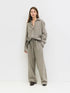 These pants feature an oversized fit with an elastic waistband and drawstring for comfort. Made from brushed striped fabric, they include side hidden pockets and a faux front partial button closure.