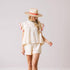 The Ivory Lottie Top features delicate eyelet details with vibrant pops of color on the ruffle sleeves. Complete with tassel side ties for an adjustable fit, this playful yet elegant top is perfect for adding a touch of charm to your summer wardrobe. Pair with our Ivory Eyelet Shorts!