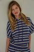Crafted from a blend of polyester, cotton, and spandex, this pullover top features a round neck, short sleeves, and a striped pattern. Its functional front pocket, elastic waistband, and drawstring hoodie add versatility and convenience to this stylish piece