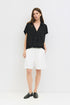 The Amara Top is a collared V-neck button-down blouse designed with clean lines and subtle structure and features cap sleeves and a back pleat. The twist detail at the hem adds a modern touch, complementing the lightweight fabric for a refined look.