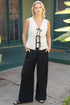 • V neckline • Sleeveless • Contrast front ribbon tie closure • Woven linen fabric vest