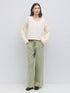 The Ashwin Sweater is a long-sleeve knit with a wide neck and drop shoulders for a relaxed fit. It features raw, rolled hems at the neckline, sleeves, and bottom hem, with a slightly curved bottom and textured knitting for added detail.