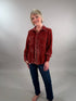 It takes a classic casual shirt style and elevates it completely with that super soft, luxurious velvet texture. The russet color is just beautiful—it's a deep, rich shade that is perfect for the holidays or just adding a warm pop of color to your everyday denim. It's relaxed enough to wear open over a simple tee, but tailored enough to button up and wear as a shirt. It’s an instant outfit maker!
