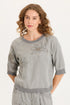 Are you looking for a way to dress up your favorite comfy pants without feeling overdone? This top is such a beautiful find. It has a relaxed, easy-going feel thanks to the soft twill fabric and raglan sleeves, but the embroidered floral and scale motifs make it feel like a special boutique piece. The mid-tone cool grey is incredibly versatile, and the real "wow" factor is in the back—a functional brass snap-up detail that adds just the right amount of edge. It’s the perfect answer for those days when you want to look polished and intentional but still be able to move and breathe comfortably.